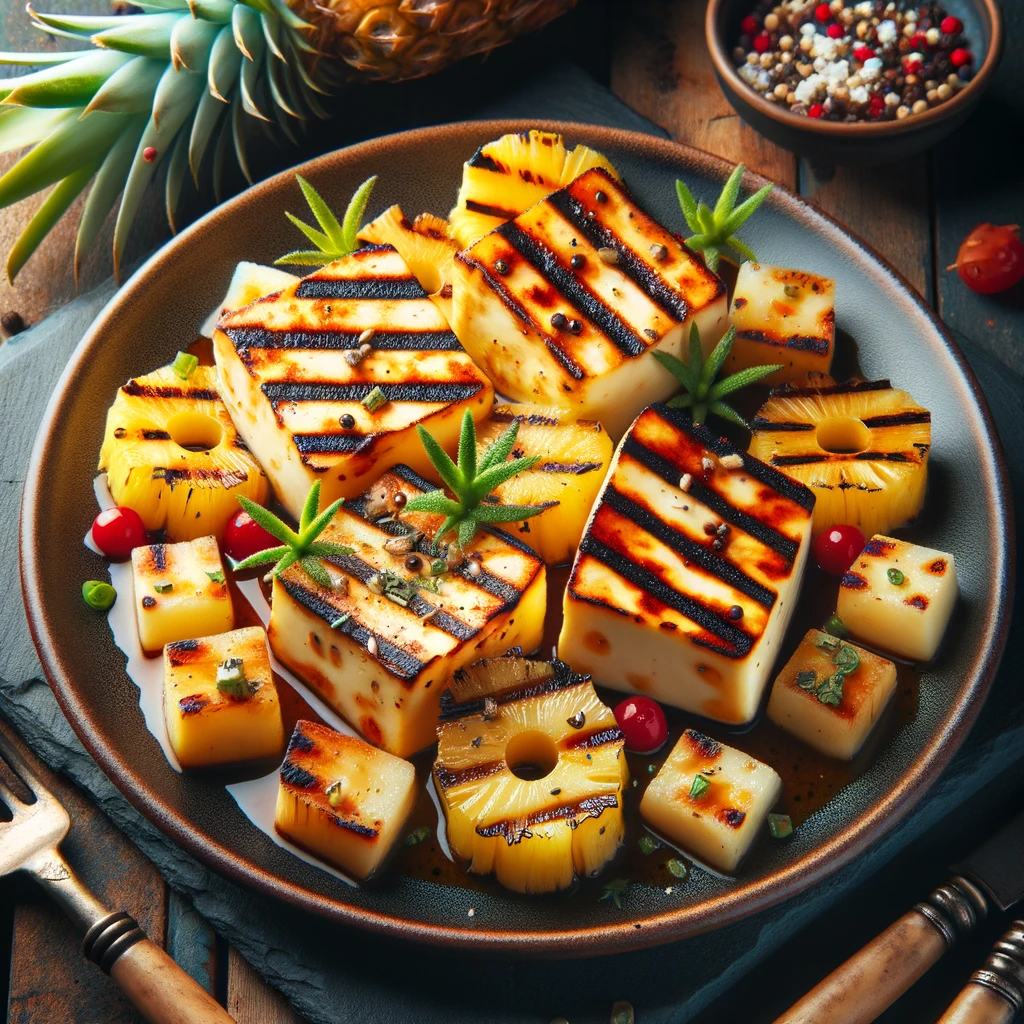 Vorsichtig die fertige Ananas vom Grill nehmen und das Fruchtfleisch mit Halloumi sofort aus den Hälften servieren.