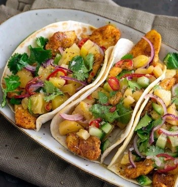 Die Tortillas mit der Ananas-Salsa und dem Hühnerfleisch füllen. Da Ganze noch mit den Korianderblättern garnieren und warm servieren.