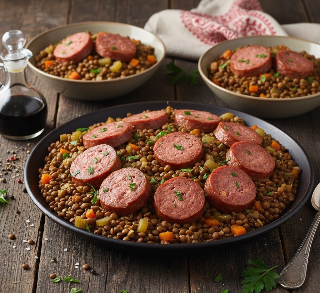 Linsen mit Cotechino sind in Italien ein klassisches Silvestergericht: Die Linsen stehen für Münzen und sollen Glück und Wohlstand im neuen Jahr bringen. Die kräftige, würzige Wurst macht das Gericht festlich und sättigend – perfekt, um gemeinsam ins neue Jahr zu starten. Linsen mit Cotechino gelten als gesund, weil die Linsen viele Ballaststoffe, pflanzliches Eiweiß, Eisen und Mineralstoffe liefern und lange satt machen. Die Wurst sorgt für zusätzliches Eiweiß und Geschmack – wegen dem Fett- und Salzgehalt sollte man sie aber in moderaten Mengen genießen.