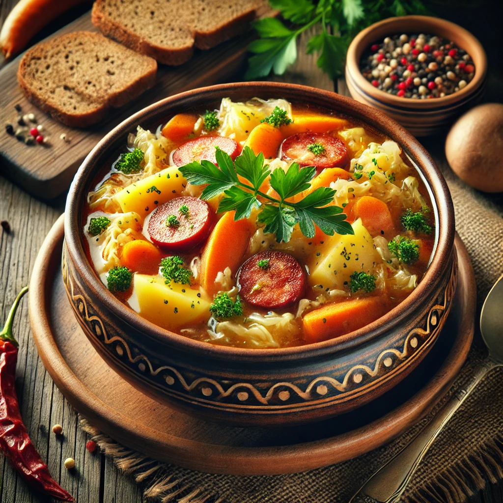 Die angebratenen Zwiebeln und Wurzeln dazugeben und so lange köcheln lassen, bis die Kartoffeln weich sind. Die Gewürzgurken reiben und zur Suppe hinzufügen. Alles weitere 5–10 Minuten köcheln lassen.