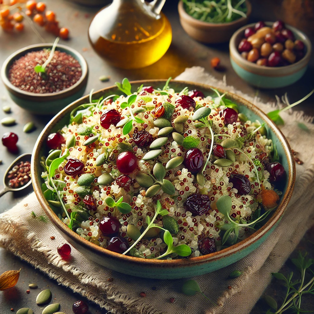 Quinoa hat einen hoher Proteingehalt und ist reich an wertvollen Mineralien (Calcium, Eisen, Zink, Magnesium, Phosphor, Vitamine A, C, B1, B, sowie E) Außerdem enthält Quinoa viele essentielle, ungesättigte Fettsäuren. Das Rezept ist für 4 Personen geeignet.