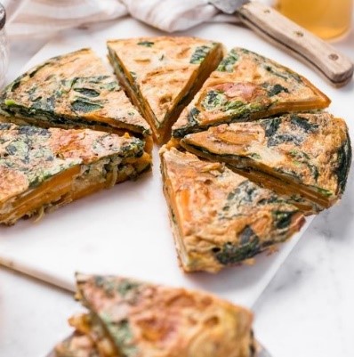 Während die Süßkartoffeln kochen die Spinatblätter abwaschen und in grobe Stücke schneiden. Den Knoblauch pressen. Die Eier in eine große Schüssel aufschlagen und mit dem gepressten Knoblauch, einer Prise Salz und einer Prise Pfeffer verquirlen. Sobald die Süßkartoffeln in der Pfanne ausreichend weich sind, den kleingeschnittenen Spinat dazugeben, alles gut umrühren und dann die Eiermischung dazu gießen. Das Ganze bei geschlossenem Deckel und sehr geringer Temperatur 10 Minuten so lange auf der Herdplatte lassen, bis die Eier ganz durch sind.