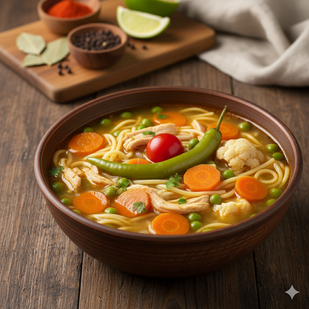 Das Huhn gründlich säubern und in einem großen Topf mit kaltem Wasser (ohne Deckel) aufsetzen. Zum Kochen bringen, Schaum abschöpfen, dann Hitze reduzieren. Mit Salz und Pfeffer würzen. Das Gemüse waschen, schälen und vorbereiten: Die Hälfte der Karotten, der Petersilienwurzel, des Sellerie, des Kohlrabi und der Zwiebel) in mittleren Stücken, die andere Hälfte später in feinen Streifen verwenden. Die Paprika am Stück und die Tomate ebenfalls hinzufügen zusammen mit dem Knoblauch, den Kohlblättern, den Pilzen, dem Spargel/Blumenkohl und den Erbsen. Die Suppe so lange zugedeckt weiterköcheln lassen, bis das Huhn gar ist. Währenddessen aus zwei Portionen der Brühe einmal die feinen Gemüsestreifen getrennt garen. Dann die Pilze, den Spargel/Blumenkohl und die Erbsen separat in der Brühe garen. Diese Methode sorgt für besonders klare Suppe und separierte Einlagen. Sobald das Huhn gar ist, herausnehmen. Die Haut und große Knochen entfernen, Das Fleisch zerkleinern. Die Suppe klaren lassen und von allen festen Zutaten befreien. Die Nudeln in der geklärten Brühe kochen. Zum Servieren in vorgewärmte Schüsseln zunächst das Hühnerfleisch, dann die Nudeln und das separat gegarte Gemüse schichten. Alles mit heißer Brühe übergießen und zum Garnieren mit Petersilie bestreuen.