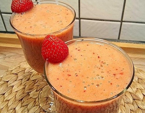 Die Erdbeeren zusammen mit der Banane, dem Pfirsich und dem restlichen Orangensaft in den Mixer geben oder mit dem Zauberstab pürieren. Alles zu dem Orangensaft in die Gläser geben, aber nicht umrühren, weil es verschiedene farbliche Schichten im Glas ergibt. Das Ganze nach Lust dekorieren und erst kurz vor dem Trinken umrühren.